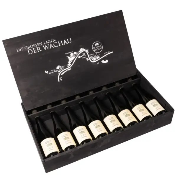 In einer edlen Holzkiste mit einer detaillierten Riedenkarte sind Weine der großen Lagen aus der Wachau, 4 Grüne Veltliner und 4 Rieslinge: